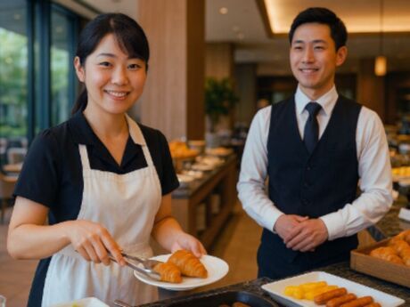 ホテルレストランのスタッフ(派遣社員)/朝or夜だけOK!バイキング形式で簡単!時間固定シフト!